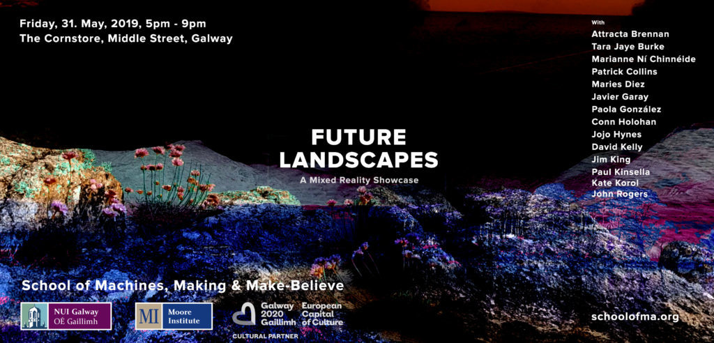Future Landscapes: Enhancing Seen & Unseen Landscapes with Mixed Reality: Also in 2019, we ran an intensive 4-week interdisciplinary workshop focused on the use of immersive technologies. This ran in collaboration with the Berlin-based School of Machines, Making & Make-believe, and Galway 2020 European Capital of Culture, and was part funded by a HEA project on Digital Literacy in Irish Humanities.