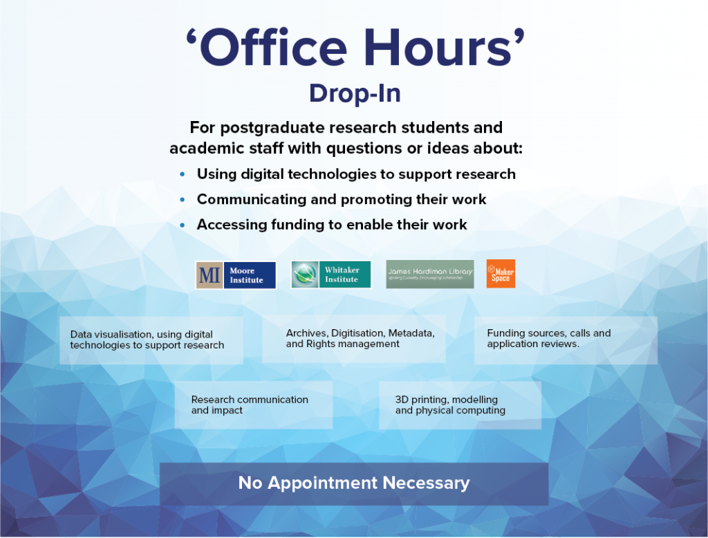 For postgraduate research students and academic staff with questions or ideas about: Using digital technologies to support research Communicating and promoting their work Accessing funding to enable their work. Meet with staff from the Moore Institute, Whitaker Institute, NUI Galway Library and the Research Office. No appointment is necessary. From 12pm - 1pm in The … Continue reading “Office Hours” Drop-in Service